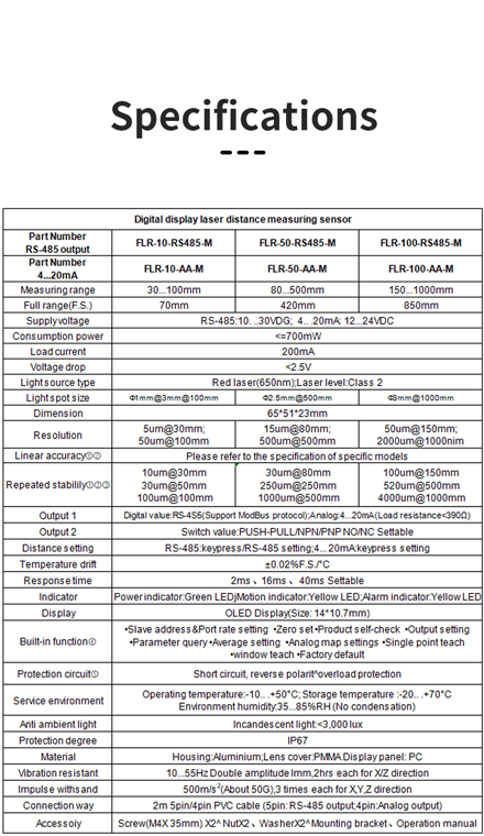 ±0.3% F.S. (150-450mm); ±0.6% F.S. (450-1000mm) |