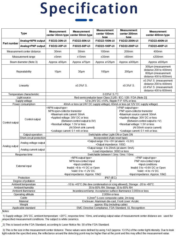 | FUWEI FSD22-30N-UI Laser Displacement Sensor Specifications | |